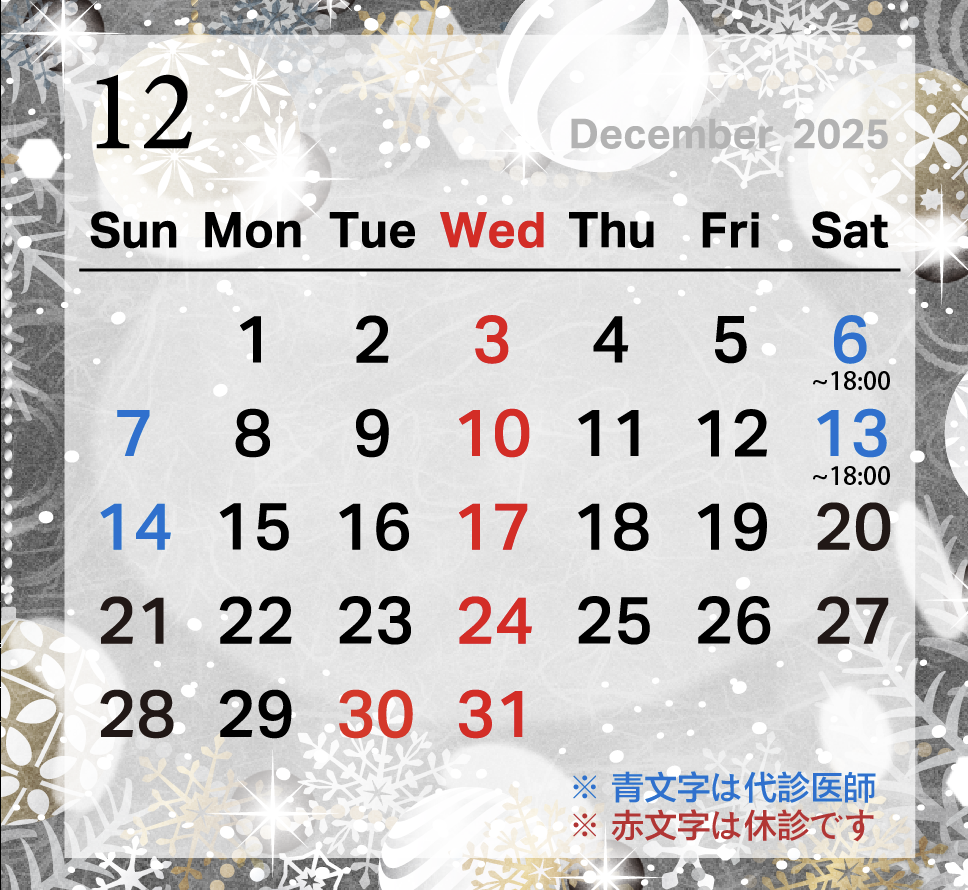 12/30(火)〜1/4(日)までは夏季休診です。